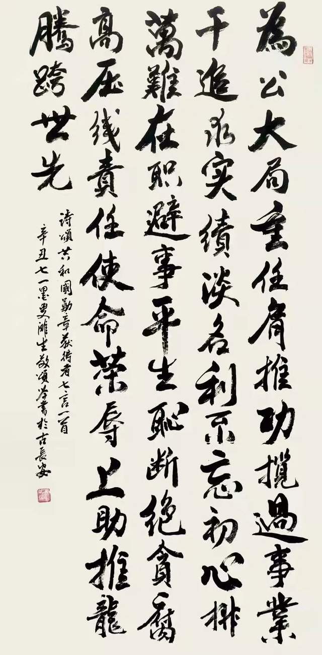 他的人物创作,在精湛运用线条造型的师古磨砺中,又有师而不泥的拓展创建。创作人物画, 笔墨随时代,有主旨,有理想,富有精神境界。又善于调度水墨浓淡,侧笔皴铺形成素描的明暗效果,让人物面孔由平面显成立意,中西合成,画如珠壁!能够用简单的水墨把人像画到形韵双绝的境界,《时代楷模张富清》这幅人物作品成为技法的经典,也是歌颂时代的艺术法典。 这就是老先生参加书画艺术展,获国内金奖五十余次,获国际金奖八次的重要原因。所以他的水墨人像,可以成为人物画的时代画谱,以之为师,可以求法新奇,也可以感受正大气象!