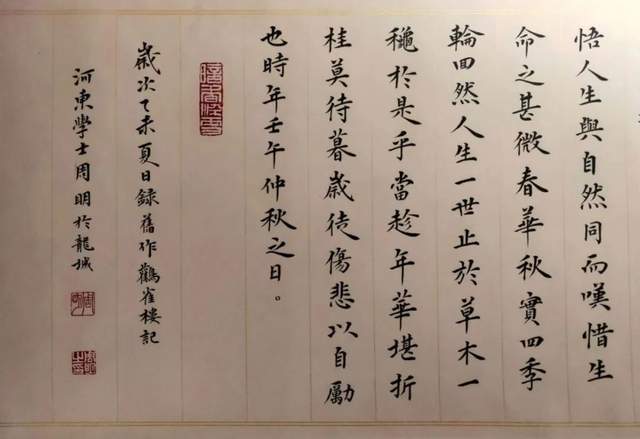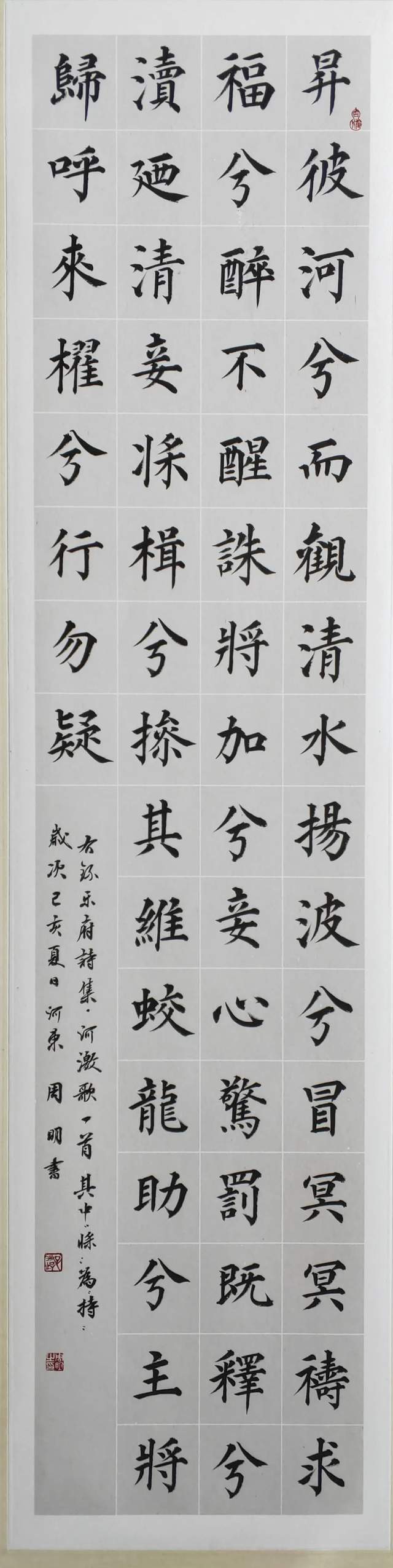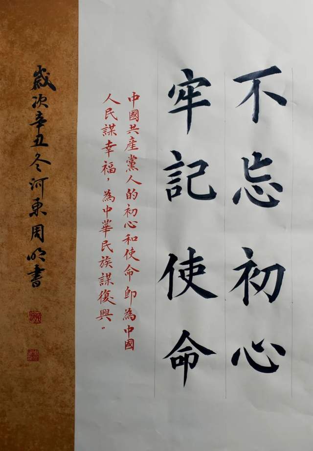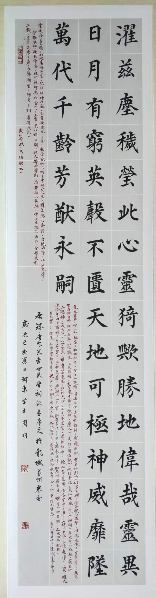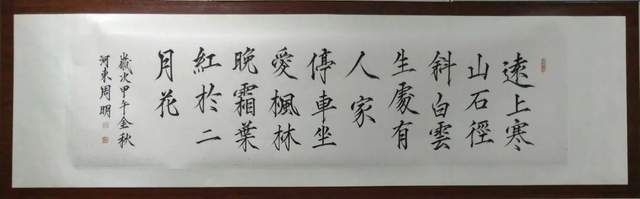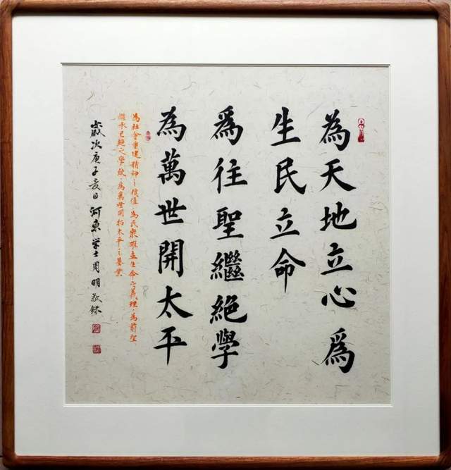 书法家周明先生写出《为天地立心》这件楷书镜心作品的时候,当是荡气回肠的表达!因为他执笔作书果然有与张载同样的精气神,区别张公以座右铭的方式畅志抒怀,周明先生则以翰墨形态表达内心的正大气象。人之所论“楷精法详”,周明先生的书法体系里果然写得“特为真正”。