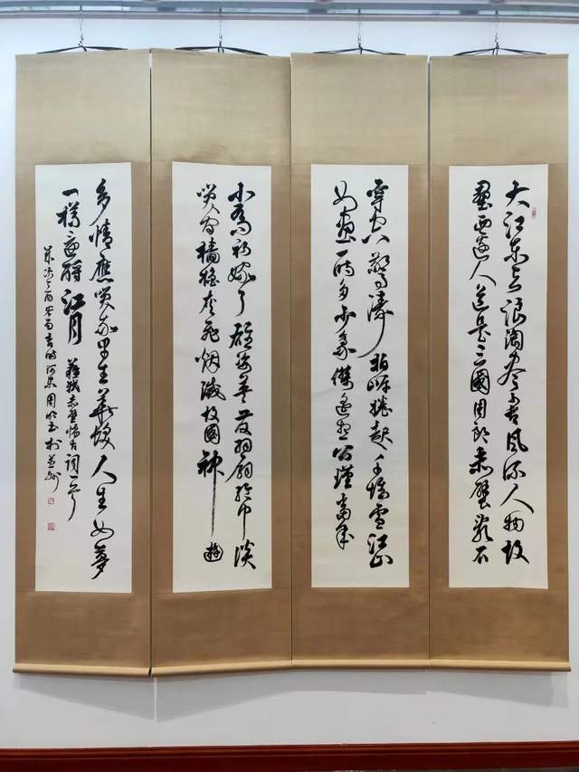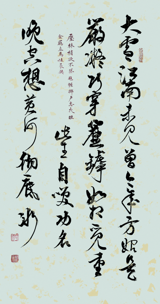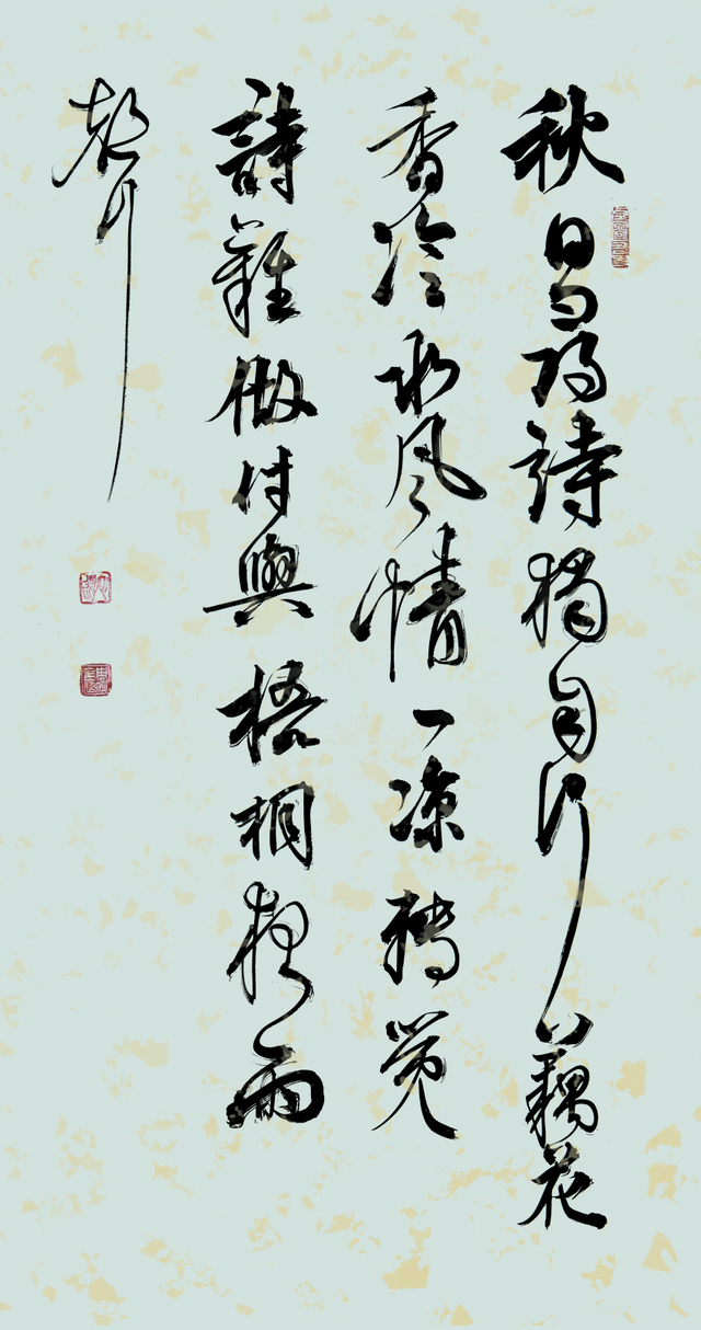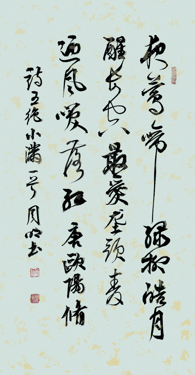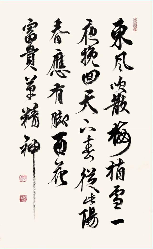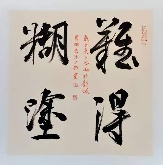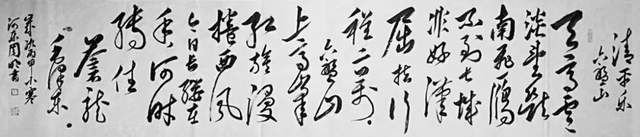 草书之稿始于汉代,崔瑗杜度始作其妙,迨乎伯英尤善其美!周明行草、草书袭承章草的丰姿多神,精研狂草的飘风骤雨,最能体现用笔千古不易的真谙,写下《天高云淡望断南飞雁》正是以狂继癫的惊雷驰电,写得纵横不群,迅驰骇人。果然是心手相师势转成,诡形怪状翻合宜。怀素草书的铁画银钩作其形,毛体草书的诗言志立其神,形神兼备,尤贵于神。当代草书一支笔的修养高度因书而现,正是翰墨横空的巍仪姿态!