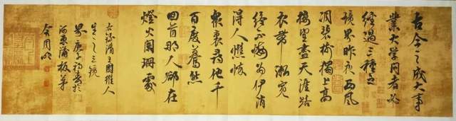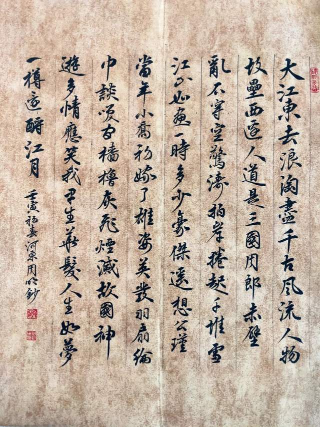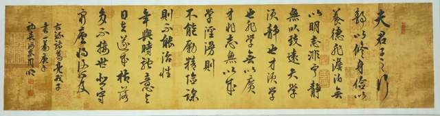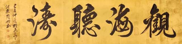 作为一名当代文人典范,周明的书法不断凝聚书卷气息,致力于让书法再次呈现晋韵宋意的天质自然。他有这种弘愿,也有这等成果。其行书精临兰亭序,写得天朗气清,惠风和畅。雅集精髓同样是如复旧观,就是与冯本并列在一起,以令世莫能辨的“真迹”!这得下多大的功夫,才能“今之视昔亦如后之视今”。在取法文人法帖的基础上,周明的行书亦能做出遂心应手在自我表达。放手写心再作《唐太宗百字箴言》,书卷气息扑面盈心,自然是赏心悦目。写下《观海听涛》最是牵丝映带,刚柔相济的书道证见。