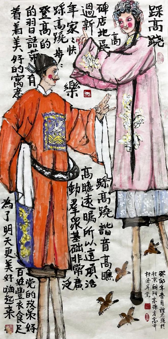 “高井是我热爱的家乡,它养育了我,也给了我丰富的创作灵感。”谭志强说,从早期的葡萄园、葡萄女到后来的运河人物、地区民俗等,都成了他创作的对象。这些源于生活的匠心之作,后来常参加朝阳区、北京市以及国家级的各类展览活动,不少作品取得奖项,为高井村带来了殊荣。如《多彩年华》入选“全国建材行业第八届书画展”获优秀;《秋实》参加纪念毛泽东诞辰125周年书画展;《姐妹情》入选“纪念中国工农红军长征胜利80周年画展”;《脱贫致富》在朝阳区社区书画摄影比赛中获得国画组十佳,有两幅作品还在第七届中新(新加坡)书画名家作品展上展出,本人更是获得“新中文化特使”称号。
