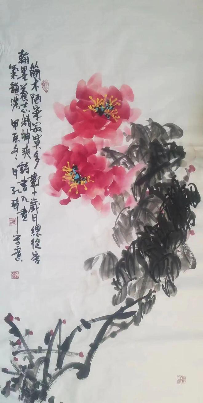 常言道,画者谨毛而失貌。如若一味追求于玲珑秀美,则画必失真气,然若一味追求朴拙茂状,则画也必将流于俗气。故如何把握其中关系,便成为所有画家都需要面对的创作难题。而看魏孔琦先生笔下花鸟,显然是能从中看到那皈依于写意风范的浑然逸笔,但设色之间,却又能使花鸟画流露出一股华润高贵之风貌,此真是藏秀美于淋漓,赋妙韵于淡然,皴法至简,不见滞处,遂见墨色常如雾露中出也!通幅牡丹的布局营构,看似是不经意间随意生发,实则处处皆是有心安排,花卉间相向不宜面凑,枝叶间转向力避蛇形,石畔栽花处,更是一面宜空,一面密叶必间疏枝,作画达理,令人悦目!