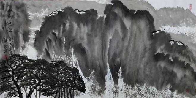 可以说,余和平先生画山水,是有着自己明确的艺术内涵定位,在这一片黑白山水中,他蕴含的是清商之气,营构的是灏素之容,墨要糙擦浑厚,笔要雄健活泼。所以欣赏他的山水画作,很难不会被其画中境界所感染,可令人心起停骖待晚之思。铅华退尽,胸涤尘埃,远视苍苍,近视茫茫,实乃操笔如在深山,居处如同野壑也。现如今的余和平先生正值创作盛期,能达到这种山水境界,也着实是值得敬佩的。在此,我们也衷心祝愿他能够继续保持此心,在山水中回味,在笔墨中归真,纸上生情,艺树常青。