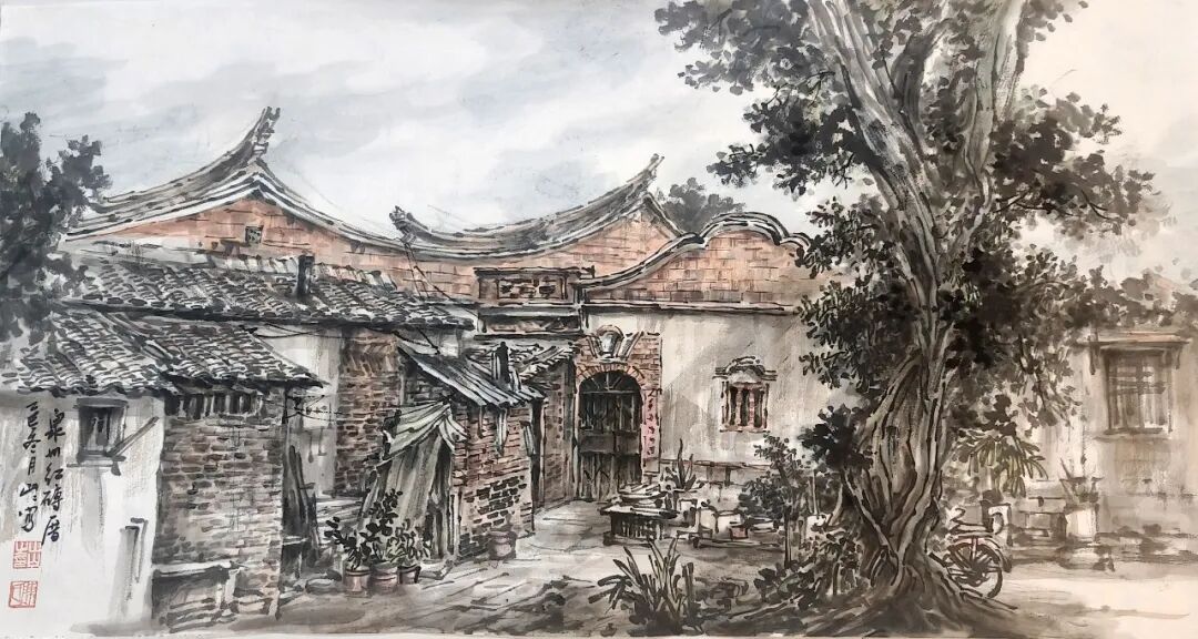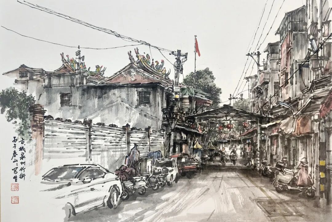 古贤论画,以气韵生动为要,以情景交融为宗,讲究外师造化,中得心源。早年,陈山山先生深悟此理,常年行走于泉州古城,将老城街巷、红砖古厝、古塔民居尽收笔底。他以写意线条为骨,勾勒古城沧桑筋骨;以水墨晕染为韵,点染闽南烟火气韵。用笔婉转灵动,不僵不板,写尽老屋檐角、石板长巷的悠然形态;用墨浓淡相宜,虚实相生,晕出斑驳砖墙、幽径深巷的静谧意境。他不刻意造景,不强行铺陈,多以写生所得入画,于寻常街角捕捉诗意,于烟火人间提炼美感,作品既有传统绘画的笔墨法度,又有鲜活的生活气息,尺幅之间,尽显古城神韵。