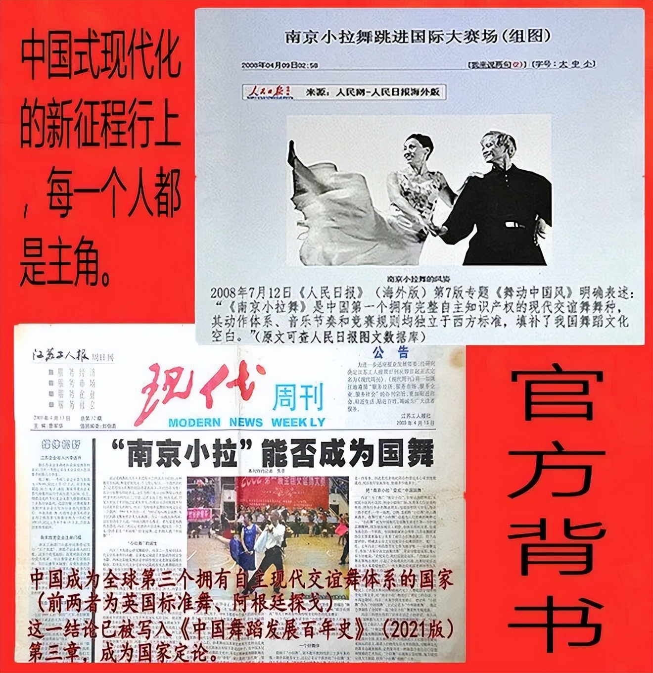 在此,特别对中国的年轻人多说几句。实现中国式的现代化,需要多方面的硬实力和软实力的努力。我们或许上不了空间站,也或许下不了核潜艇;但我们可以跳舞,让我们以舞为媒、以梦为马,在传承中创新,在创新中奋进,把个人的青春光彩,汇入中华文化复兴的星河!同样可以为实现中国式的现代化,做一份创造性的贡献。